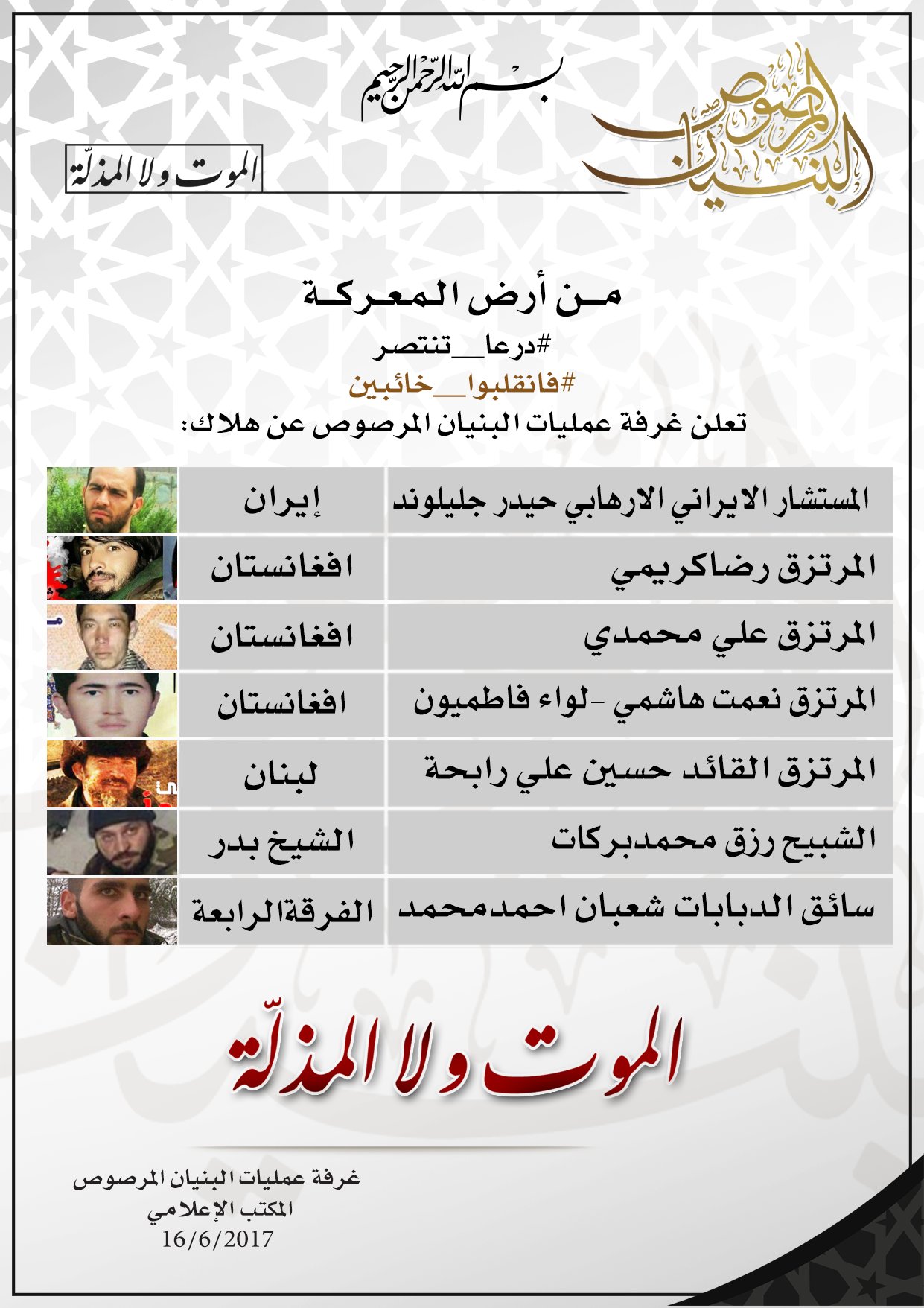 غرفة عمليات البنيان المرصوص تعلن مقتل المستشار الإيراني حيدر جليلوند