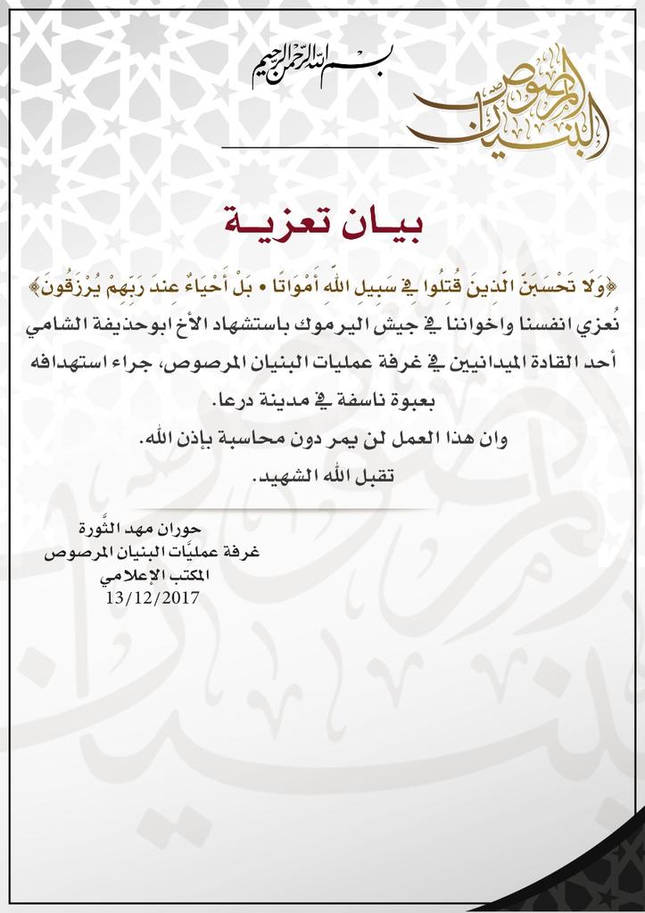 بيان تعزية من غرفة عمليات البنيان المرصوص بالقائد الميداني في جيش اليرموك أبو حذيفة الشامي