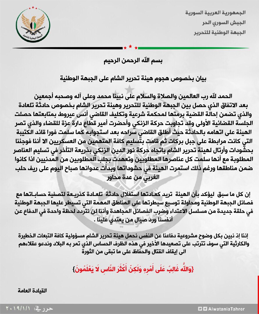 بيان من الجبهة الوطنية للتحرير بخصوص هجوم هيئة تحرير الشام على حركة نور الدين زنكي