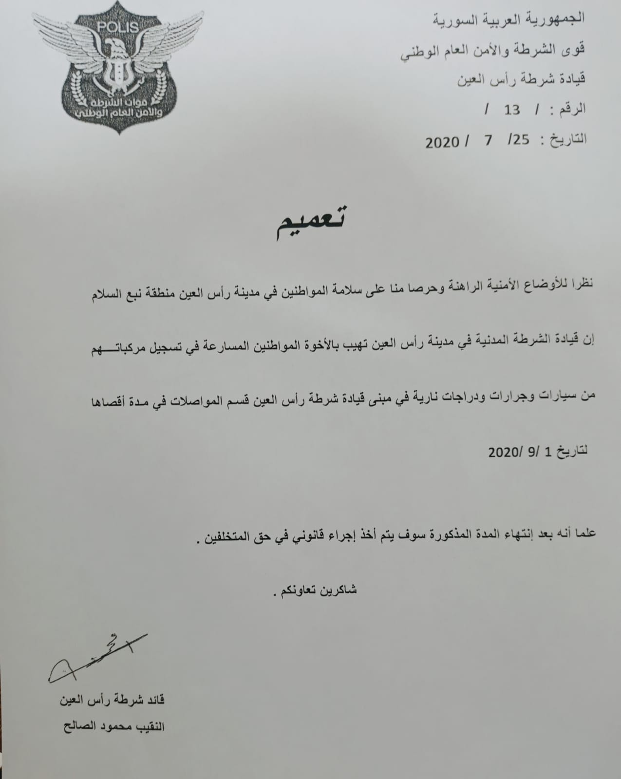 بيان من قوات الشرطة والامن العام في مدينة رأس العين تدعو فيه الأهالي إلى المسارعة في تسجيل مركباتهم في دائرة المواصلات