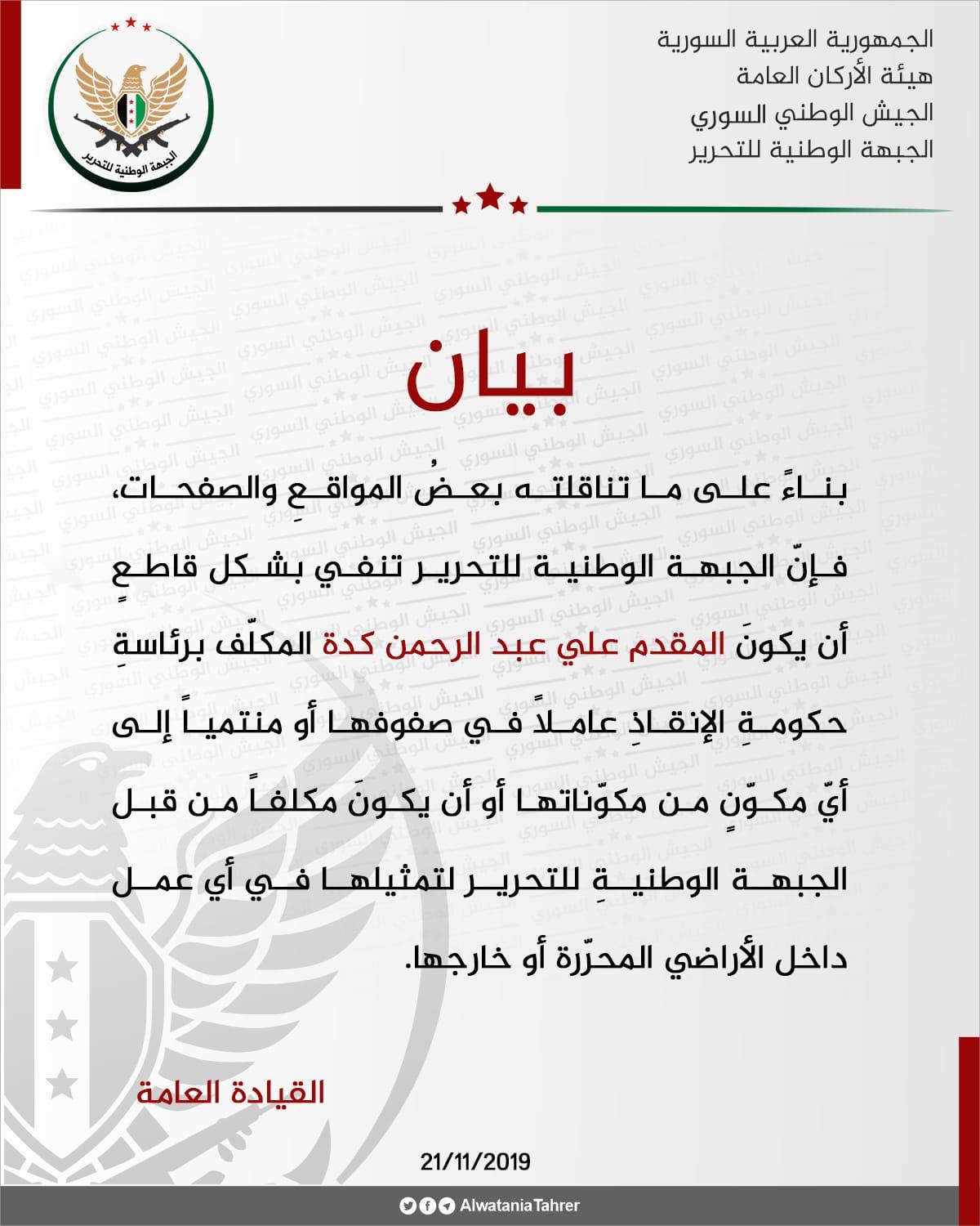 بيان نفي من الجبهة الوطنية للتحرير بنفي انتماء رئيس حكومة الإنقاذ علي كدة إلىها