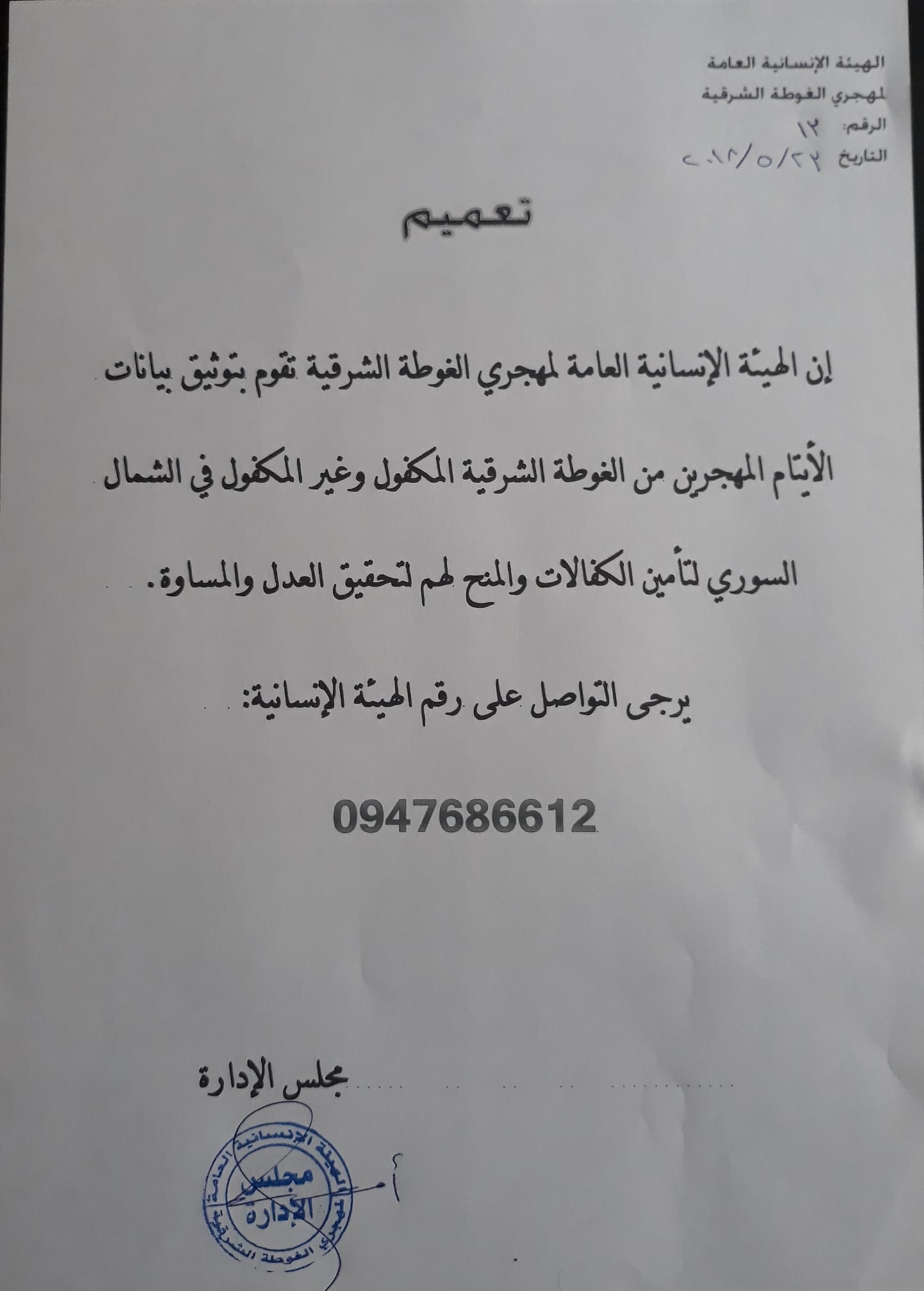 تعميم الهيئة الإنسانية العامة لمهجري الغوطة الشرقية بخصوص توثيق بيانات الأيتام