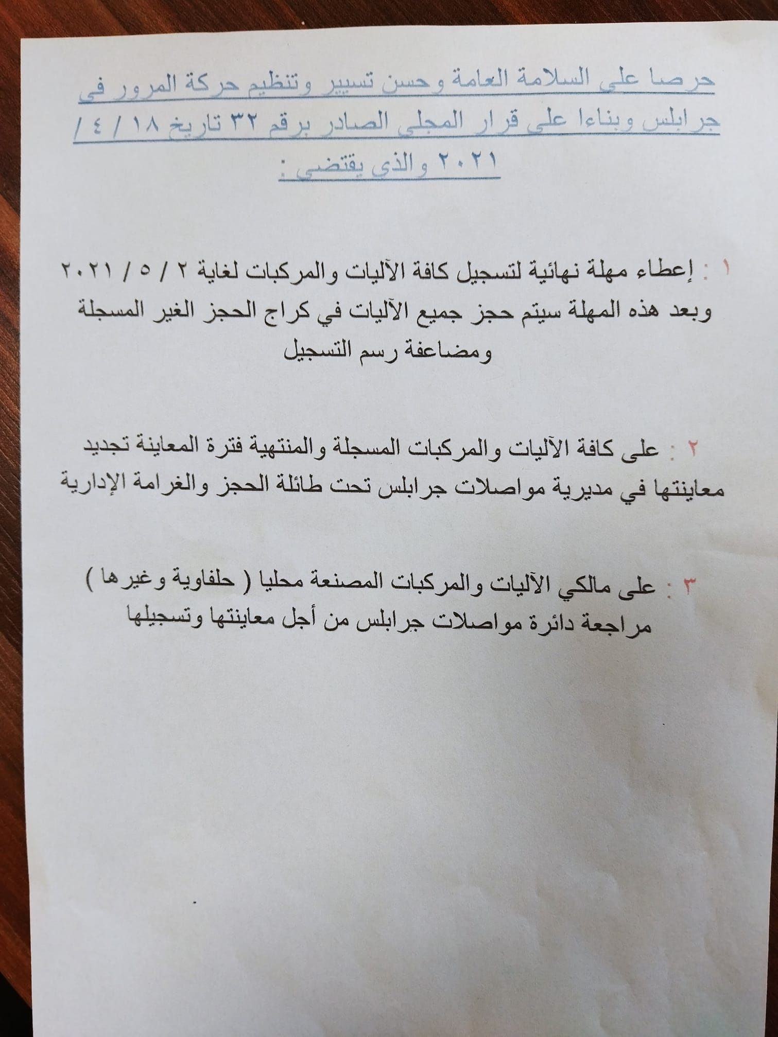 تعميم من قوات الشرطة و الأمن العام الوطني في جرابلس بضروة تسجيل جميع الآليات والمركبات تحت طائلة الحجز للمخالفين