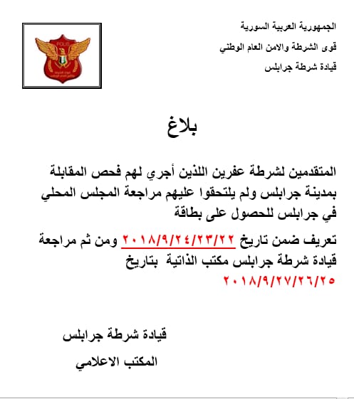 بيان من قوات الشرطة و الأمن العام الوطني في جرابلس إلى المتقدمين لشرطة عفرين وأجروا فحص المقابلة في مدينة جرابلس