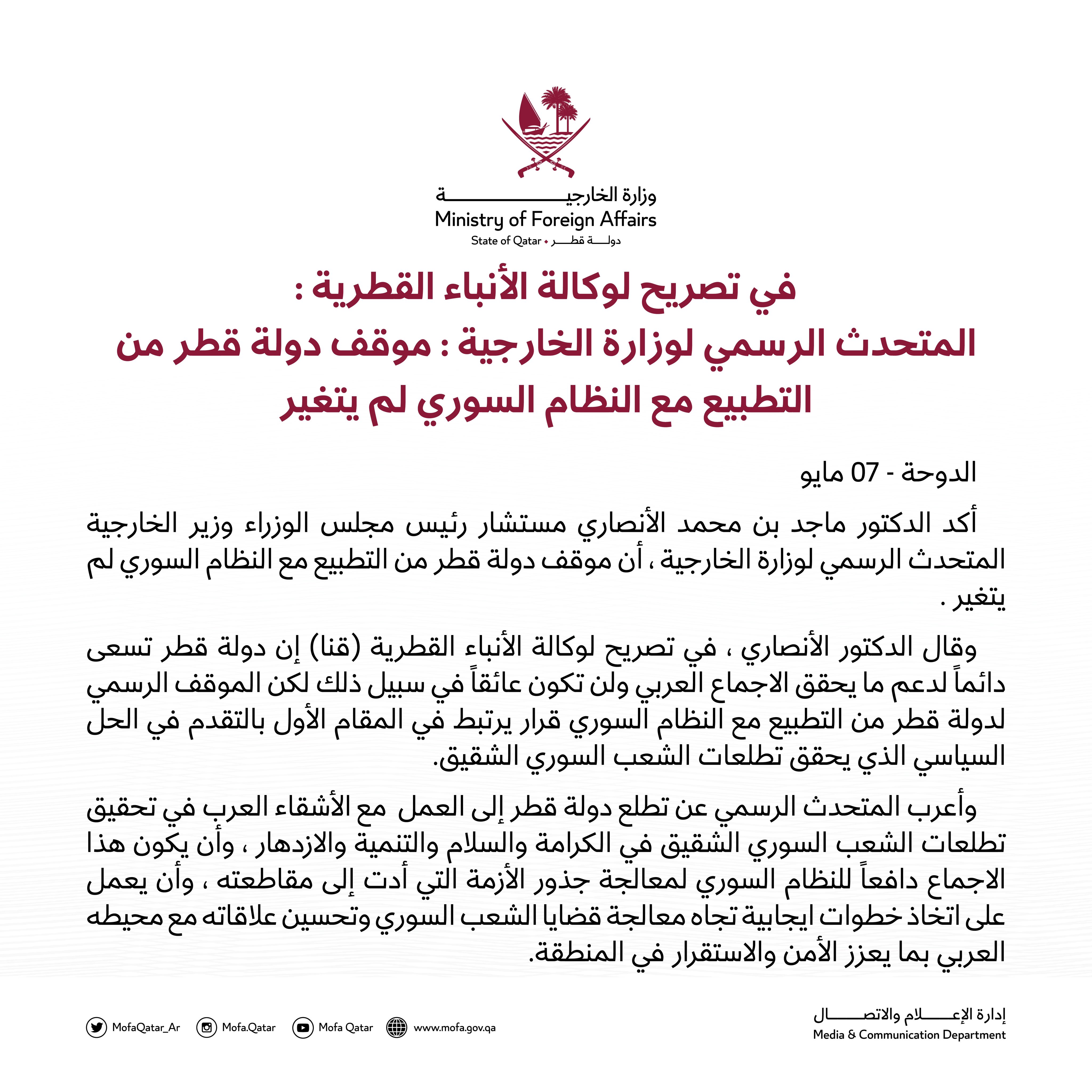 تصريح المتحدث الرسمي باسم وزارة الخارجية القطرية حول موقف قطر من التطبيع مع النظام السوري بعد قرار جامعة الدول العربية رقم 8914