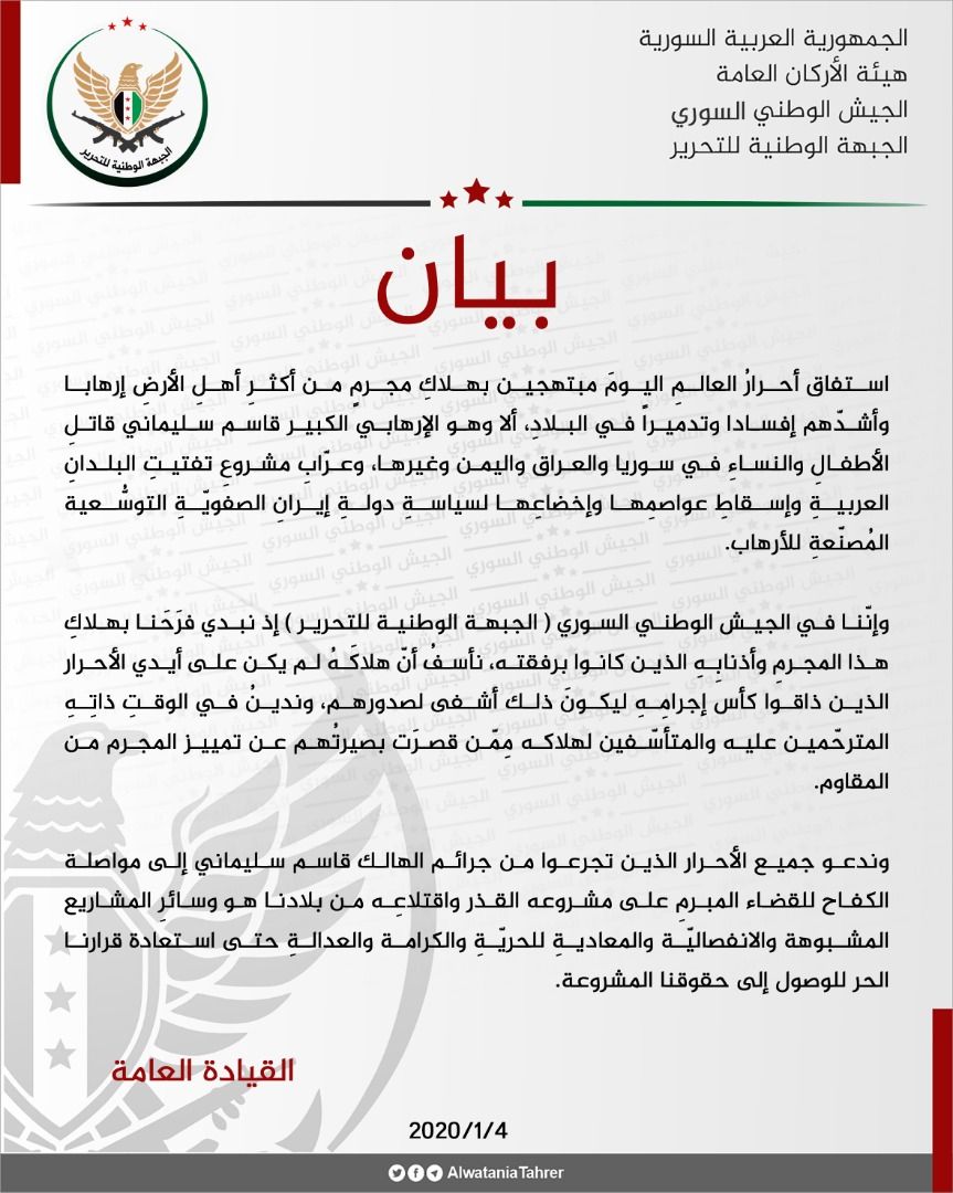 بيان من الجبهة الوطنية للتحرير حول مقتل قاسم سليماني قائد فيلق القدس الإيراني