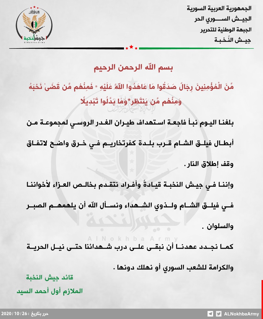 بيان تعزية من جيش النخبة بقتل عدد من مقاتلي فيلق الشام نتيجة الغارة الروسية على جبل الدويلة