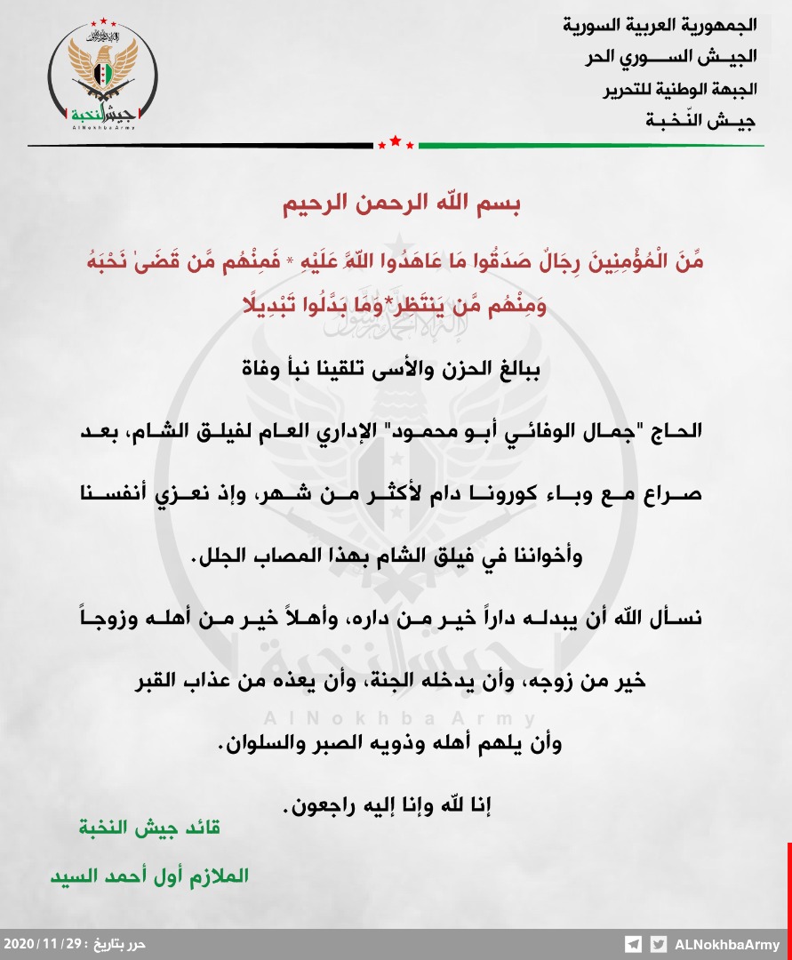 بيان تعزية من جيش النخبة بوفاة القيادي في فيلق الشام جمال الوفائي