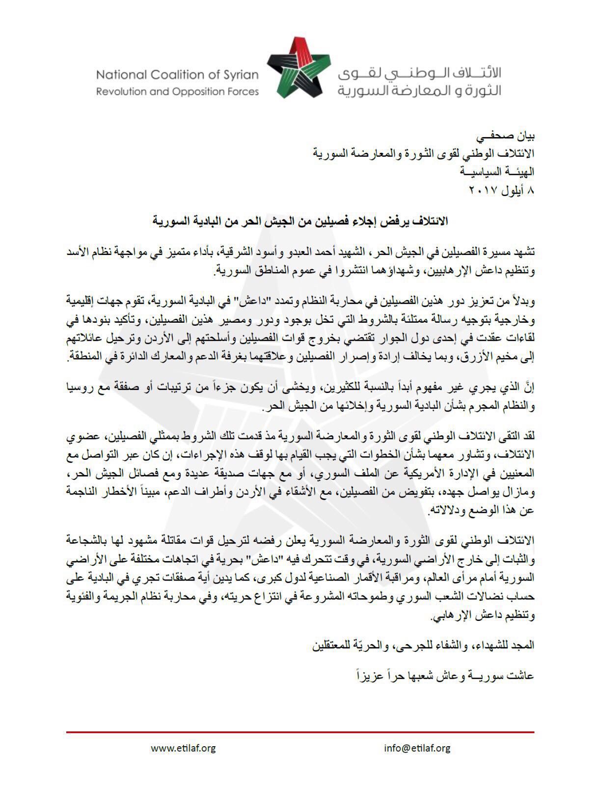 بيان صحفي من الائتلاف الوطني برفض إجلاء فصيلين من الجيش الحر من البادية السورية