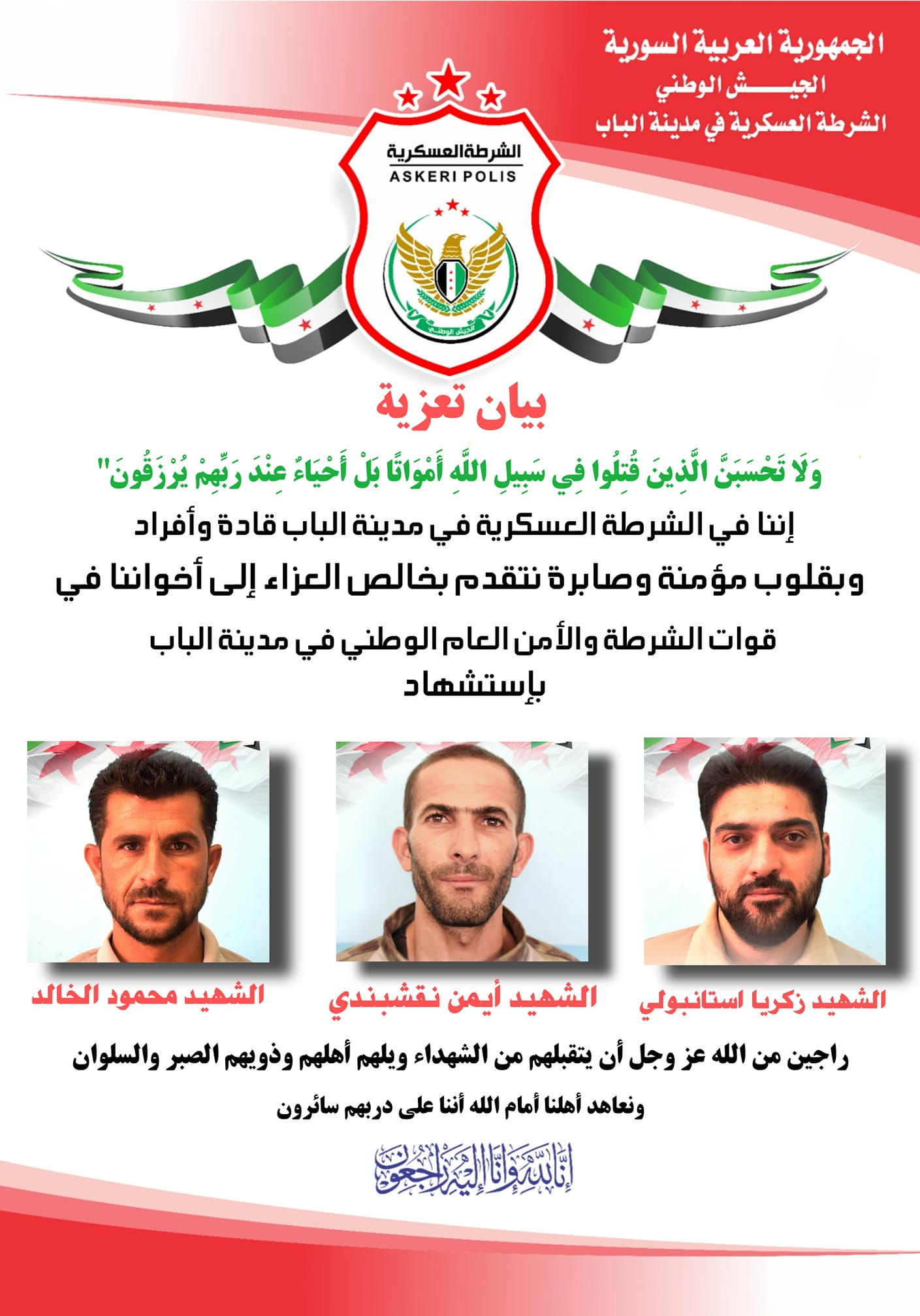 بيان من فرع الشرطة العسكرية في مدينة الباب تعزي فيه مديرية الشرطة والأمن بعدد من عناصرها