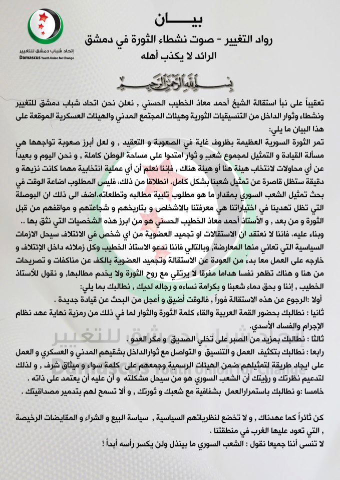 تعقيباً على نبأ استقالة الشيخ أحمد معاذ الخطيب الحسني , نعلن نحن اتحاد شباب دمشق للتغيير ونشطاء وثوار الداخل من التنسيقيات الثورية وهيئات المجتمع المدني والهيئات العسكرية الموقعة على هذا البيان ما يلي: