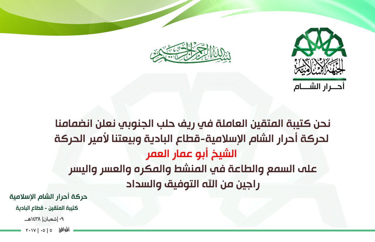 بيان انضمام كتيبة المتقين العاملة بريف حلب الجنوبي إلى قطاع البادية في حركة أحرار الشام الإسلامية