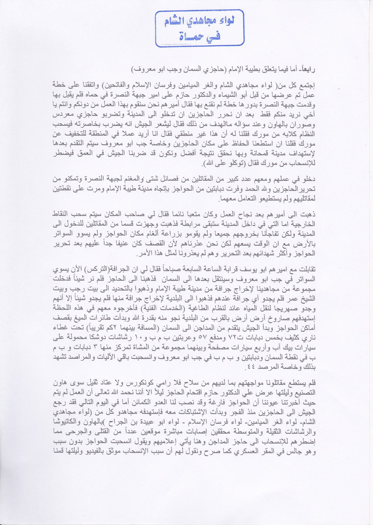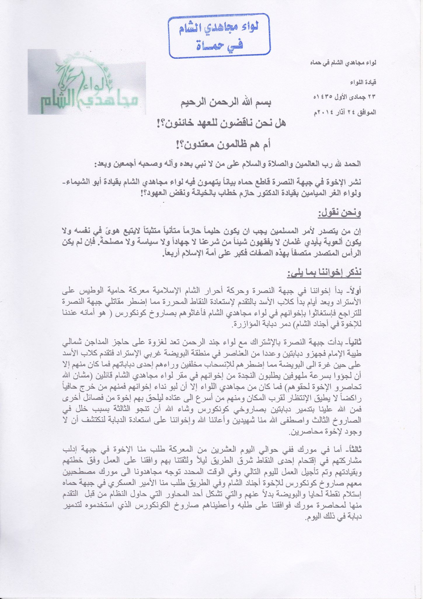 تعليق لواء مجاهدي الشام في حماة بخصوص اتهام جبهة النصرة للواء بالخيانة ونقض العهود