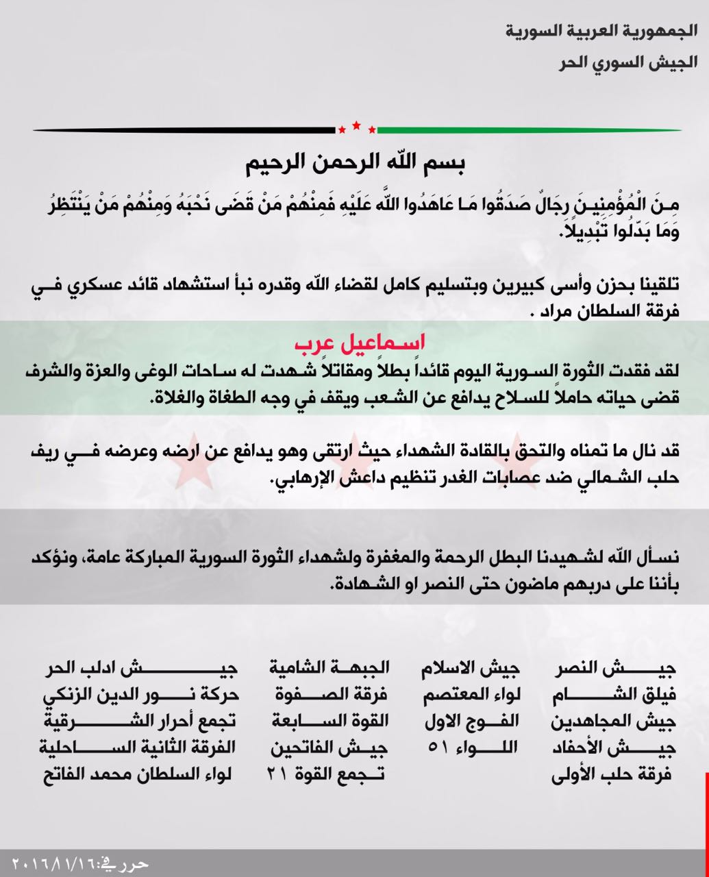 بيان تعزية من الفصائل العسكرية بإسماعيل عرب القائد العسكري في فرقة السلطان مراد