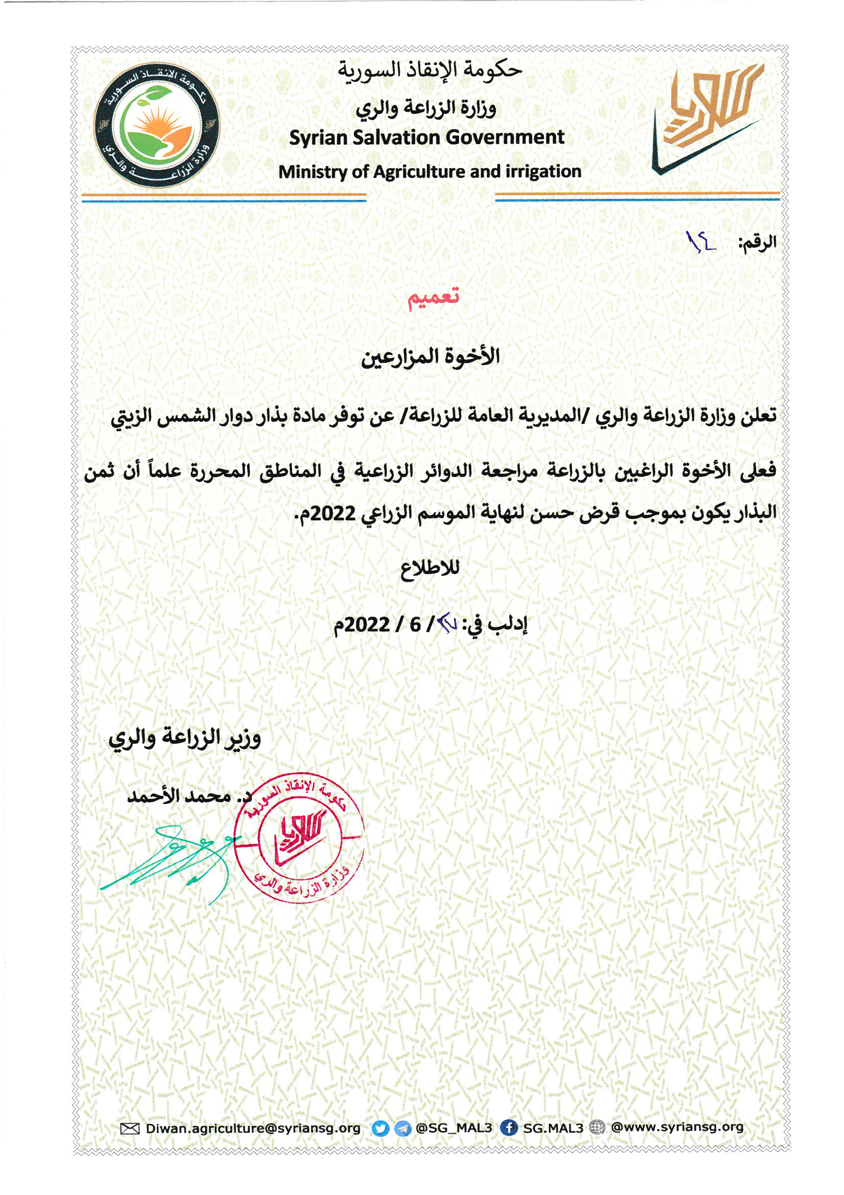 إعلان حكومة الإنقاذ السورية عن توفر بذار دوار الشمس الزيتي لدى وزارة الزراعة والري