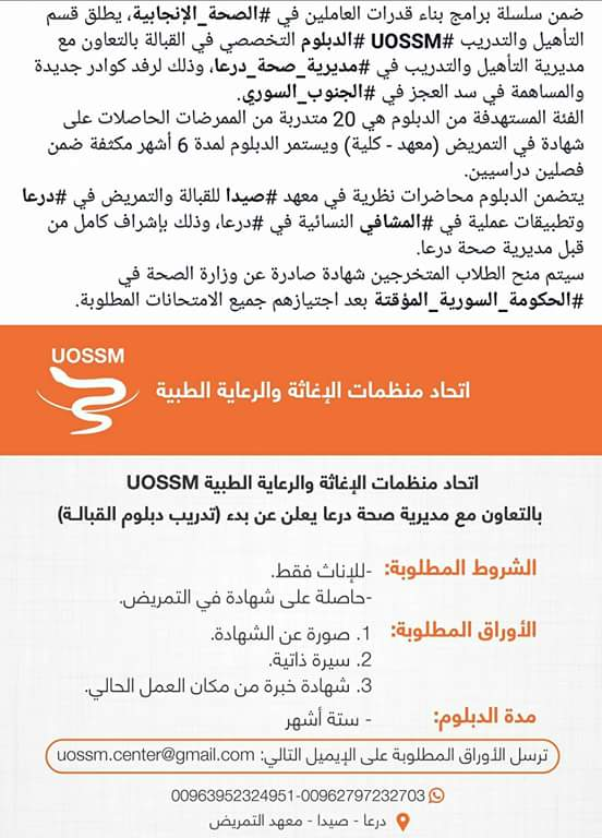 إعلان اتحاد منظمات الإغاثة والرعاية الطبية عن إطلاق تدريب دبلوم القبالة في محافظة درعا