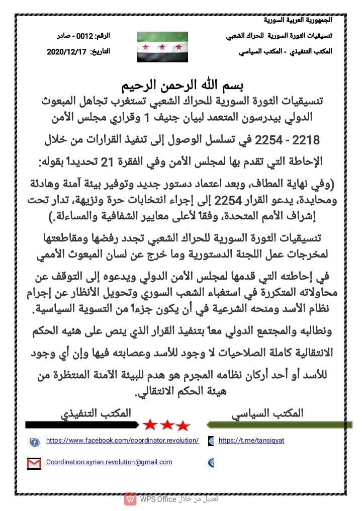 بيان تنسيقيات الثورة السورية للحراك الشعبي ضد إحاطة المبعوث الدولي حول تسلسل الوصول إلى تنفيذ القرار 2254