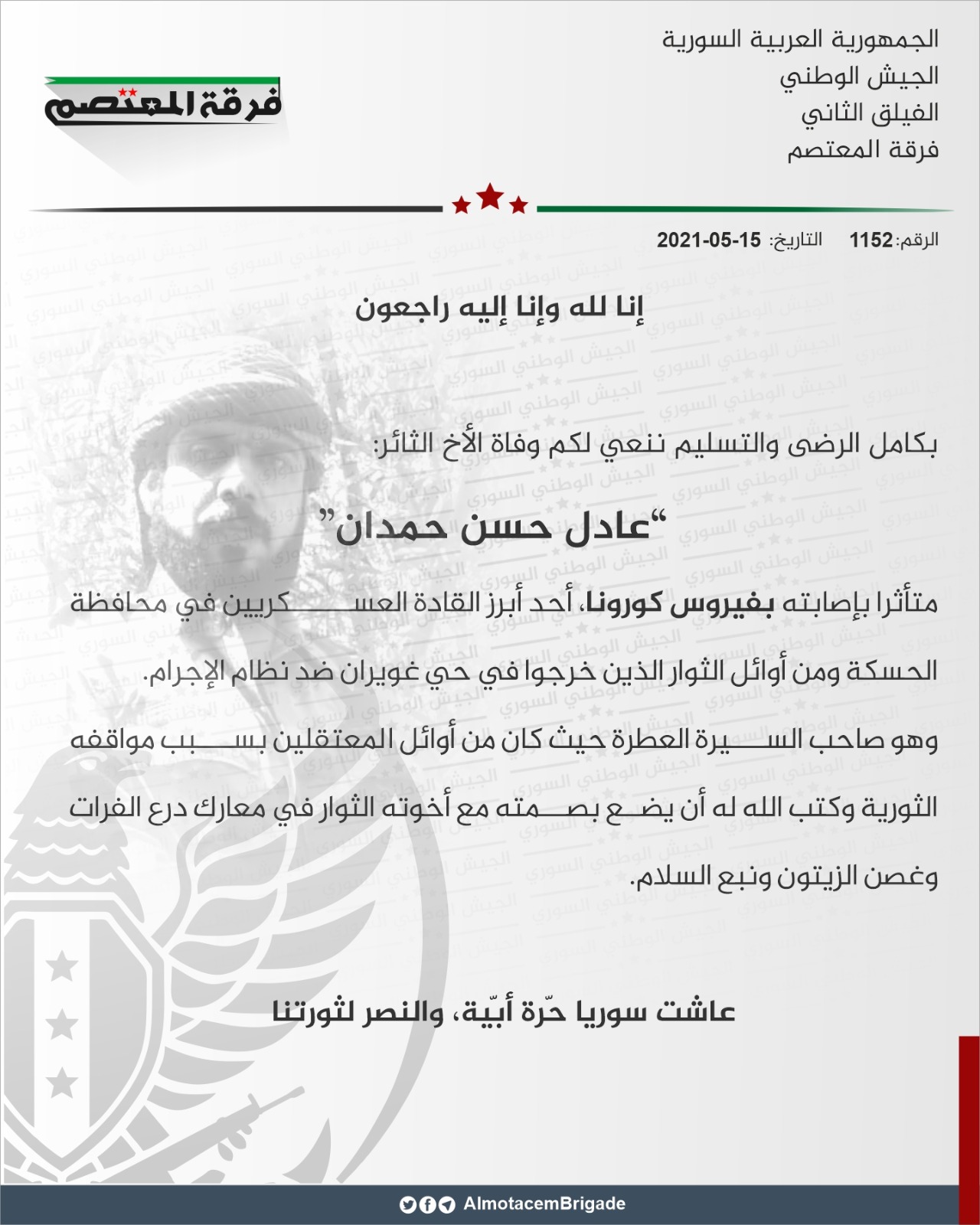 بيان من فرقة المعتصم تنعي أحد قادتها عادل حسن حمدان