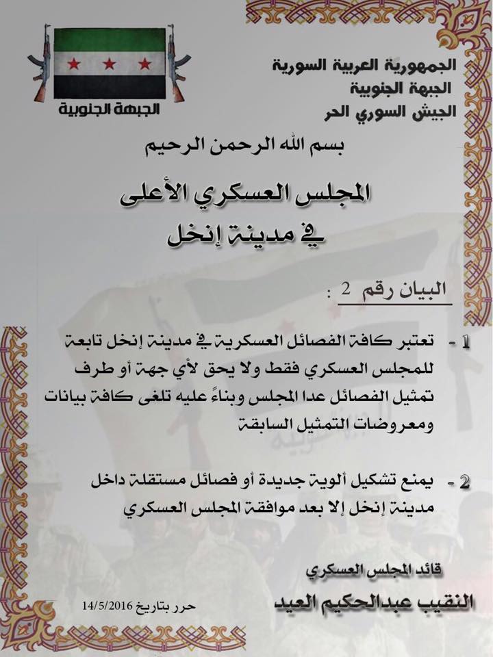 بيان من المجلس العسكري في مدينة إنخل يؤكد فيه تبعية جميع الفصائل العسكرية في المدينة للمجلس