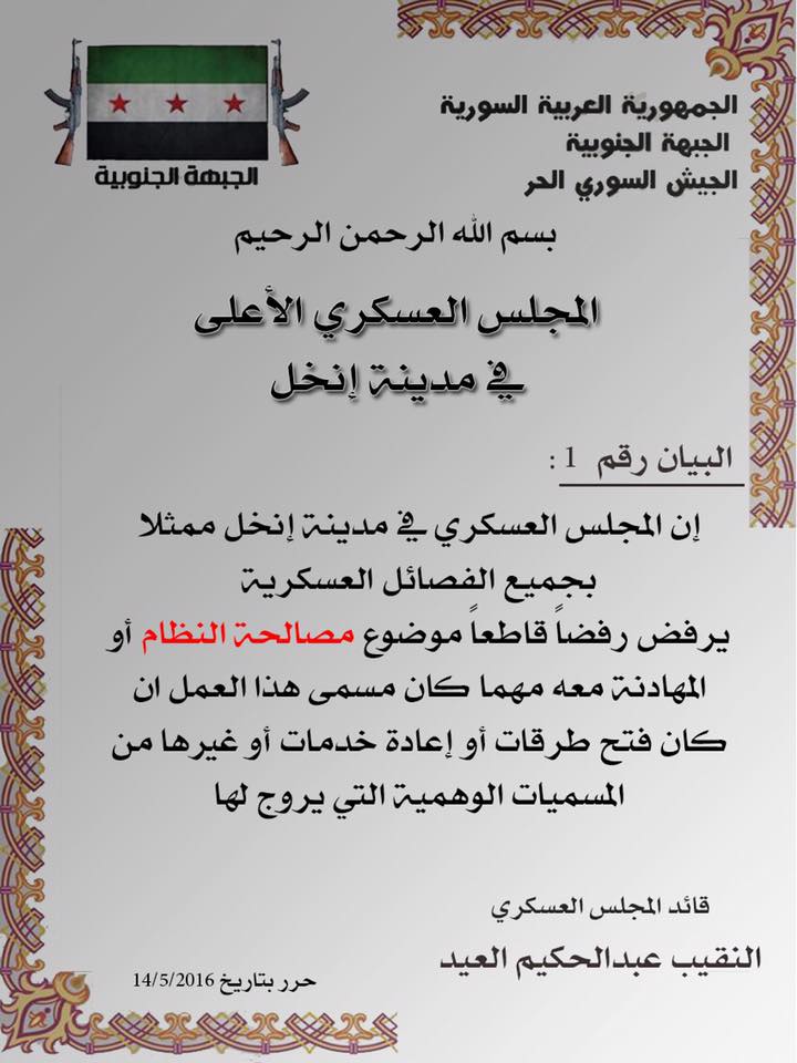 إن المجلس العسكري في مدينة إنخل ممثلاً بجميع الفصائل العسكرية يرفض رفضاً قاطعاً موضوع مصالحة النظام أو المهادنة معه مهما كان مسمى هذا العمل إن كان فتح طرقات أو إعادة خدمات أو غيرها من المسميات الوهمية التي يروج لها