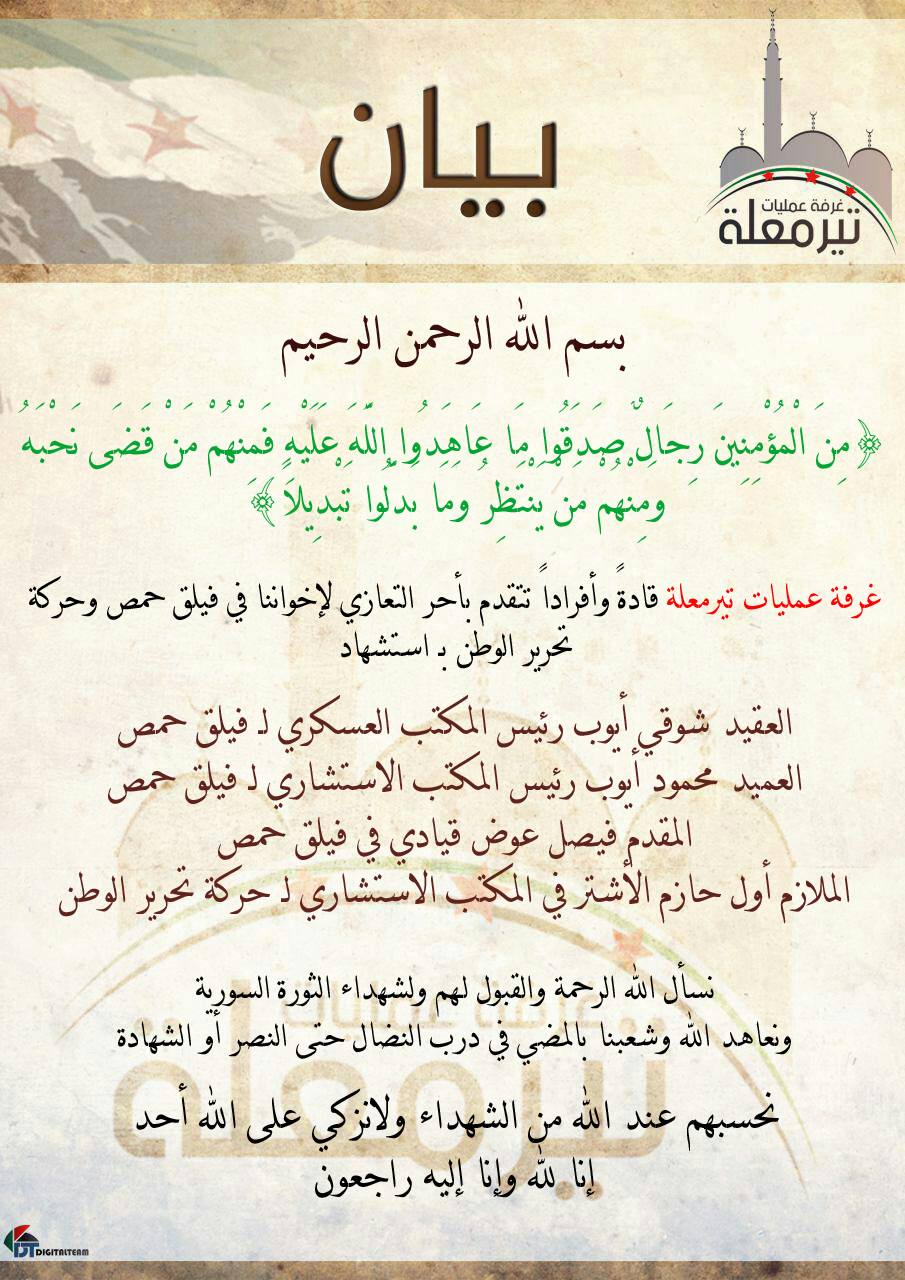 بيان من غرفة عمليات تير معلة تعزي فيه فيلق حمص وحركة تحرير الوطن بعدد من ضباطهم