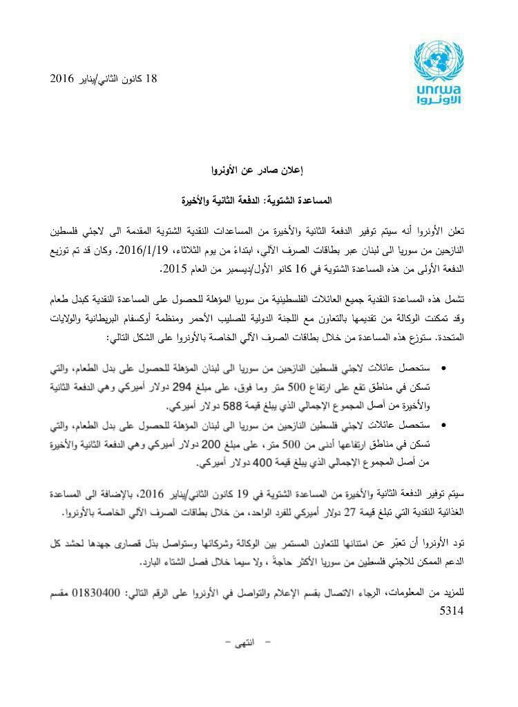 إعلان وكالة غوث وتشغيل اللاجئين الفلسطينيين الأونروا في لبنان عن بدء توزيع المساعدة الشتوية الثانية والأخيرة في شتاء عام 2016