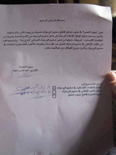 بيان لجبهة النصرة في مخيم اليرموك تتعهد فيه بحماية قوافل الأمم المتحدة الإغاثية وضمان دخولها وخروجها سالمة