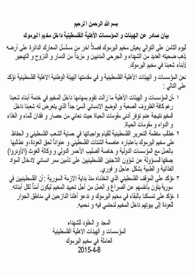 بيان صادر عن الهيئات والمؤسسات الأهلية الفلسطينية داخل مخيم اليرموك حول الأوضاع داخل المخيم