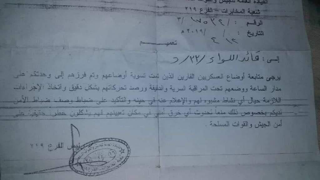 وثيقة مسربة من شعبة المخابرات الفرع 219 تفيد بطلب مراقبة عناصر المصالحات على مدار الساعة واعتقالهم في حال الاشتباه بهم