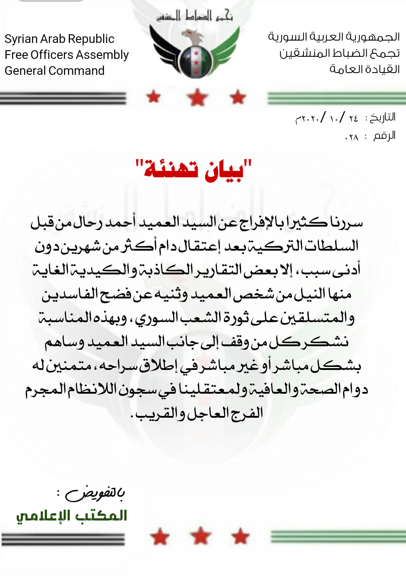 بيان من تجمع الضباط المنشقين "المبادرة الوطنية" تهنئ فيه العميد أحمد رحال بإطلاق سراحه من قبل السلطات التركية