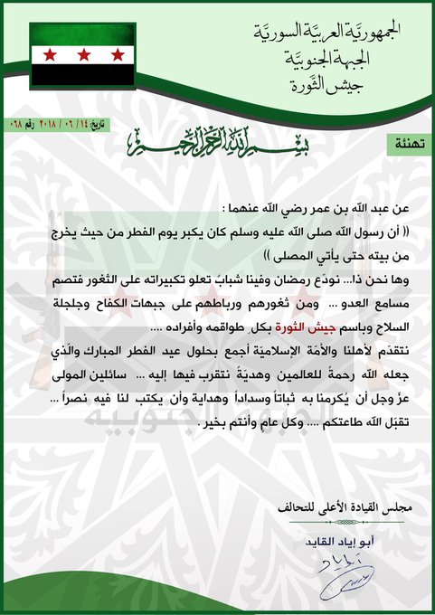 بيان من جيش الثورة يهنئ فيه الشعب السوري بعيد الفطر