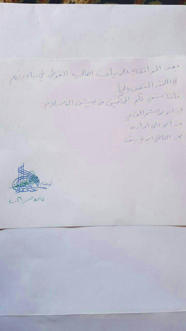 بيان من جيش الإسلام في الغوطة الشرقية يعيّن فيه أسماء الأشخاص المكلفين بالتفاوض مع لجنة حل الخلاف بين الجيش وفيلق الرحمن