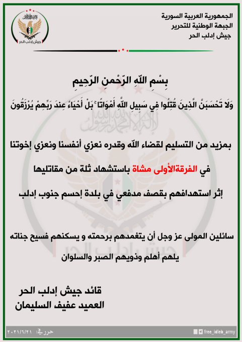 بيان من جيش إدلب الحر يعزي فيه الفرقة الأولى مشاة بعدد من مقاتليها بقصف استهدف احسم في إدلب