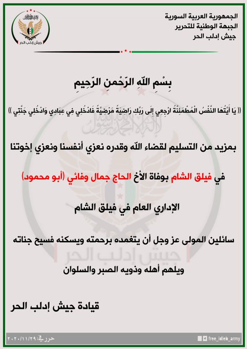 بيان من جيش إدلب الحر يعزي فيه فيلق الشام بوفاة الإداري العام في الفيلق جمال وفقائي