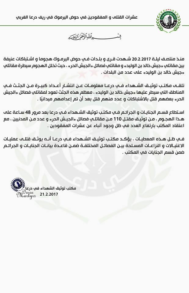 بيان لمكتب توثيق الشهداء في مدينة حول عدد ضحايا مجزرة الإعدام التي نفذها جيش "خالد بن الوليد" خلال 48 ساعة في حوض اليرموك في ريف درعا الغربي