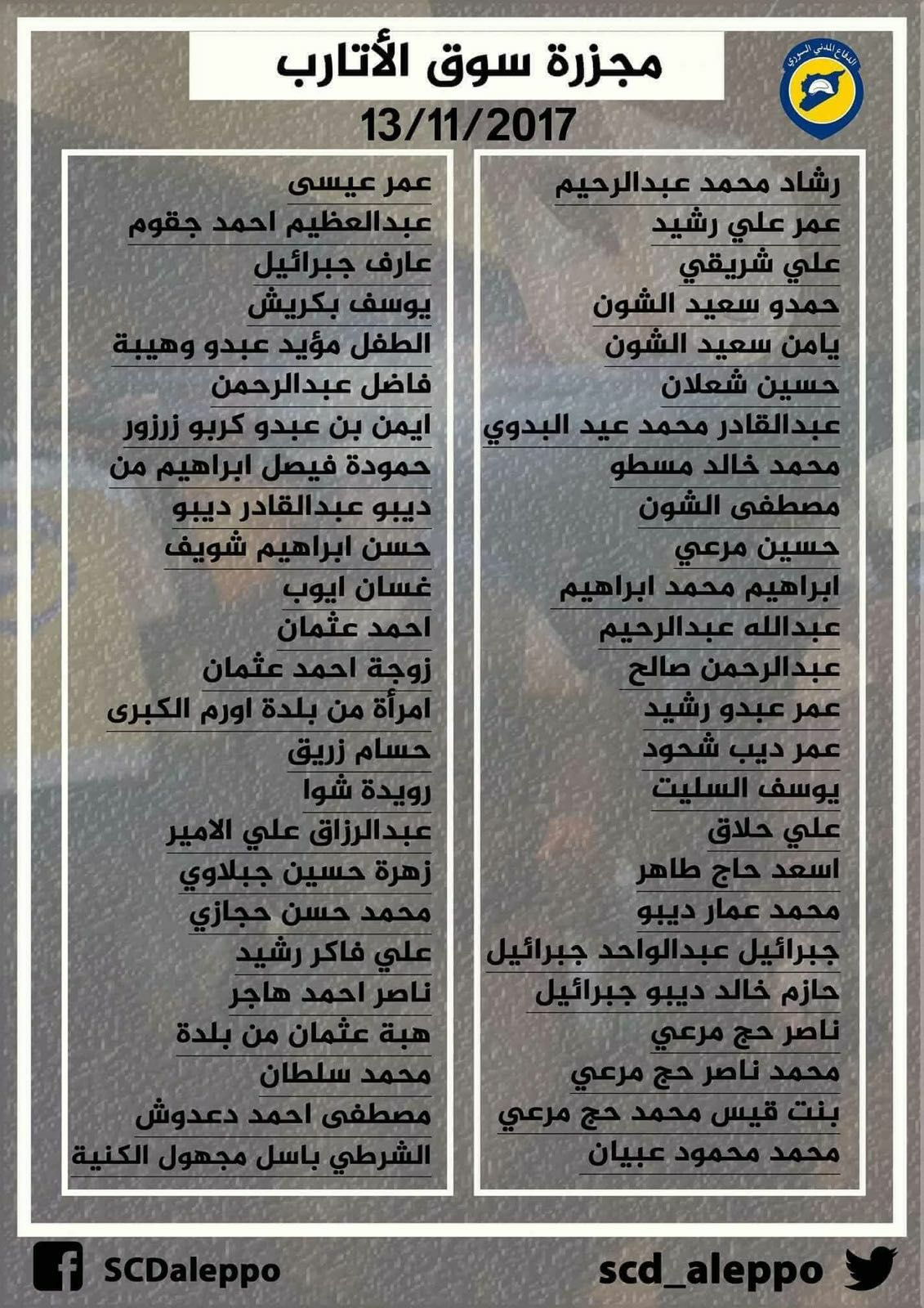 قائمة من الدفاع المدني -الخوذ البيضاء- بأسماء ضحايا مجزرة القصف على سوق الأتارب