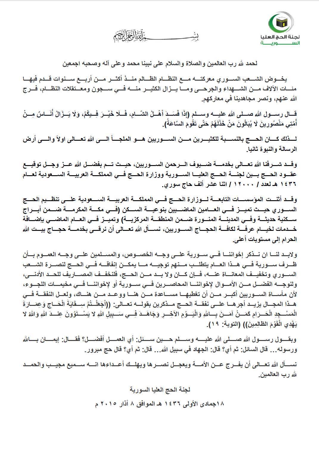 بيان لجنة الحج العليا عن توقيع "الاتفاق على ترتيبات شؤون الحج" لموسم 2015م/1436هـ
