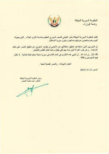 تهنئة من رئاسة الحكومة السورية المؤقتة إلى الشعب السوري بمناسبة ذكرى الجلاء