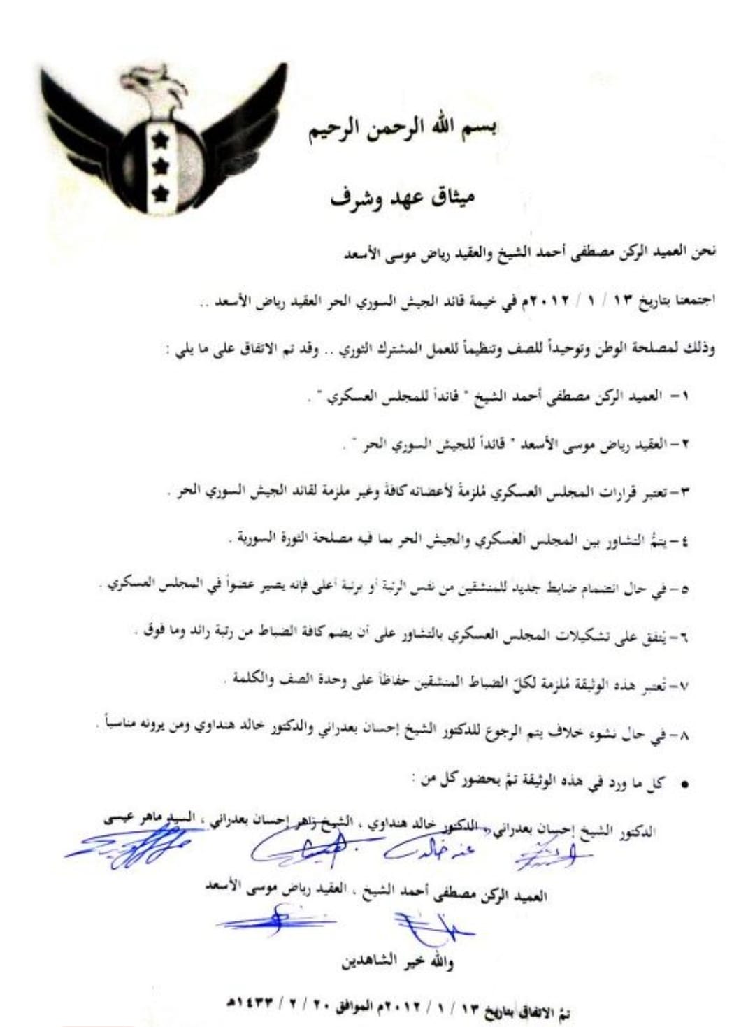 7- تعتبر هذه الوثيقة ملزمة لكل الضباط المنشقين حفاظاً على وحدة الصف والكلمة.
