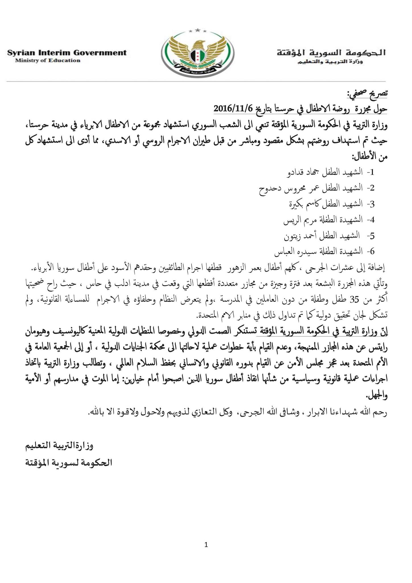 تصريح صحفي لوزارة التربية والتعليم في الحكومة المؤقتة بخصوص مجرزة روضة الأطفال في حرستا
