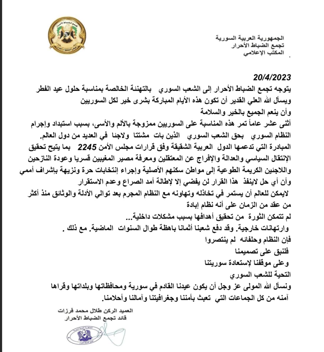 تجمع الضباط الاحرار يهنئ الشعب السوري بعيد الفطر