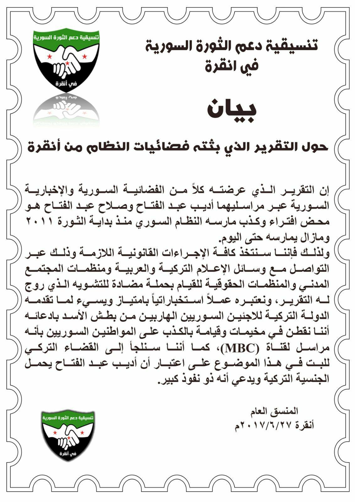 بيان توضيح من تنسيقية دعم الثورة في أنقرة حول التقرير بثته فضائيات النظام السوري من أنقرة