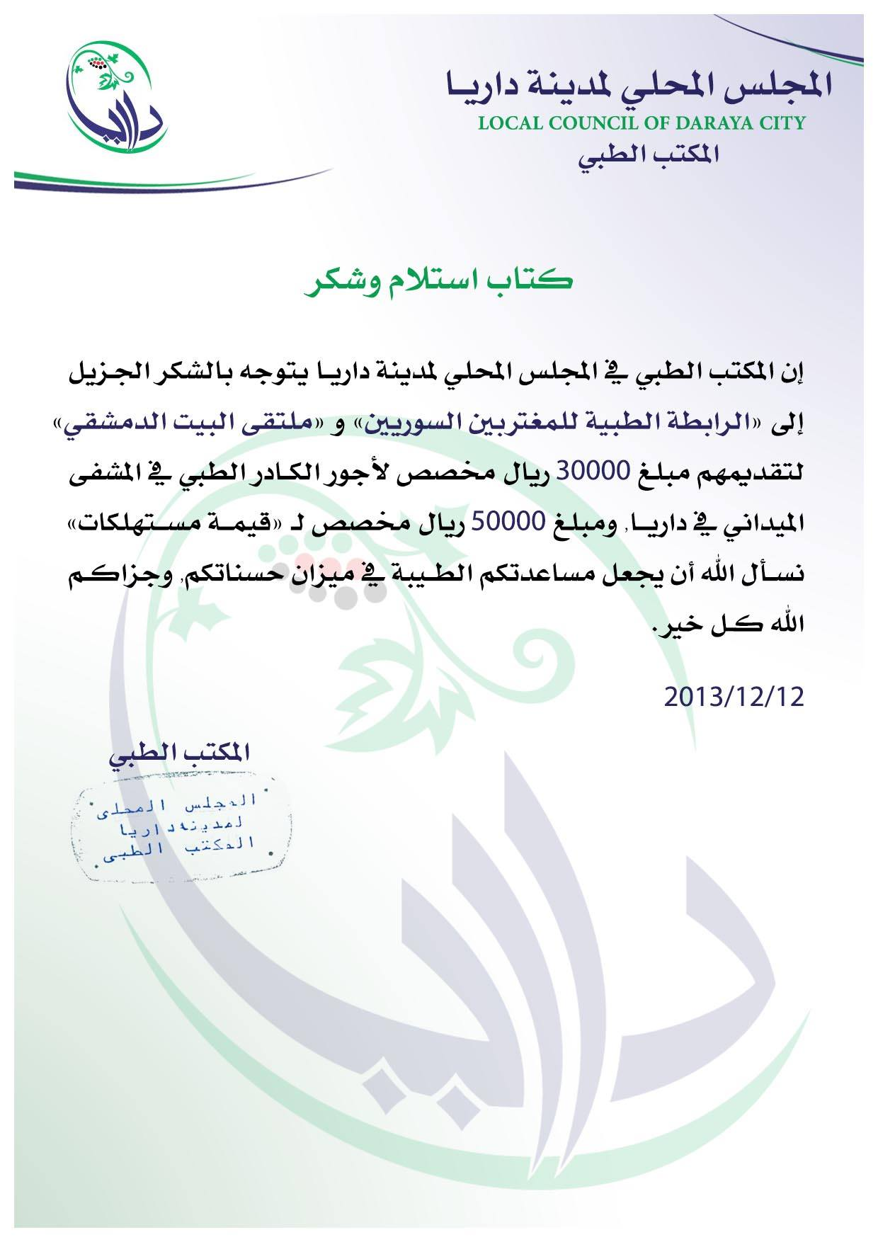 كتاب استلام وشكر من المجلس المحلي لمدينة داريا لملتقى البيت الدمشقي والرابطة الطبية للمغتربين السوريين على دعم المجلس المحلي بمبالغ مالية