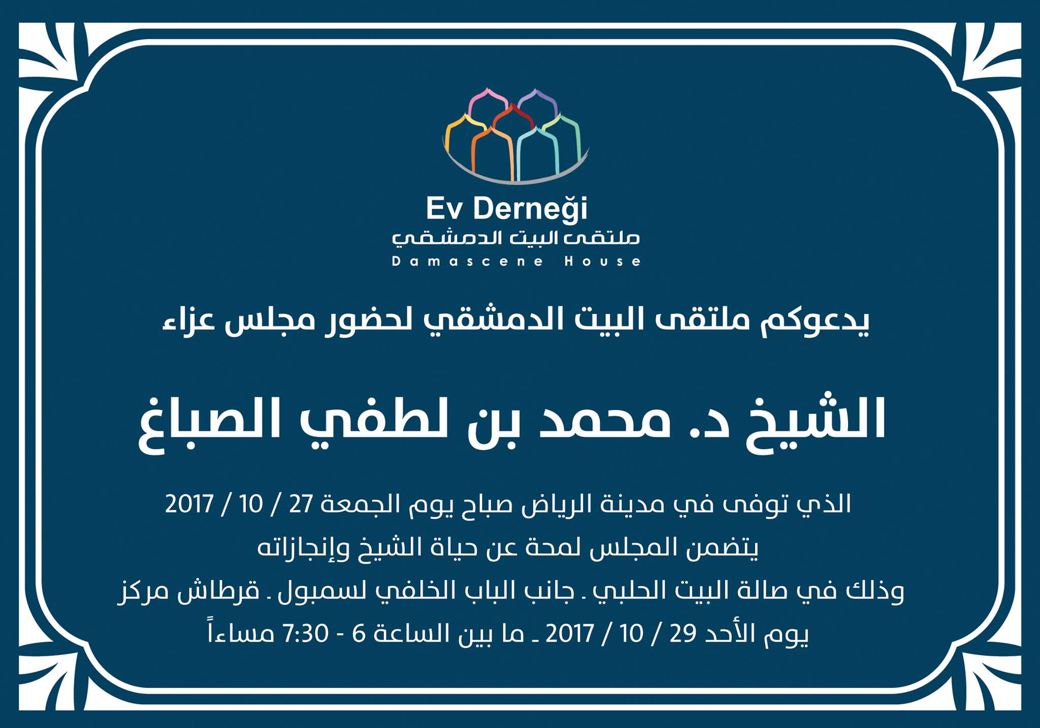 دعوة ملتقى البيت الدمشقي لحضور مجلس عزاء الشيخ محمد لطفي الصباغ في مدينة عنتاب التركية