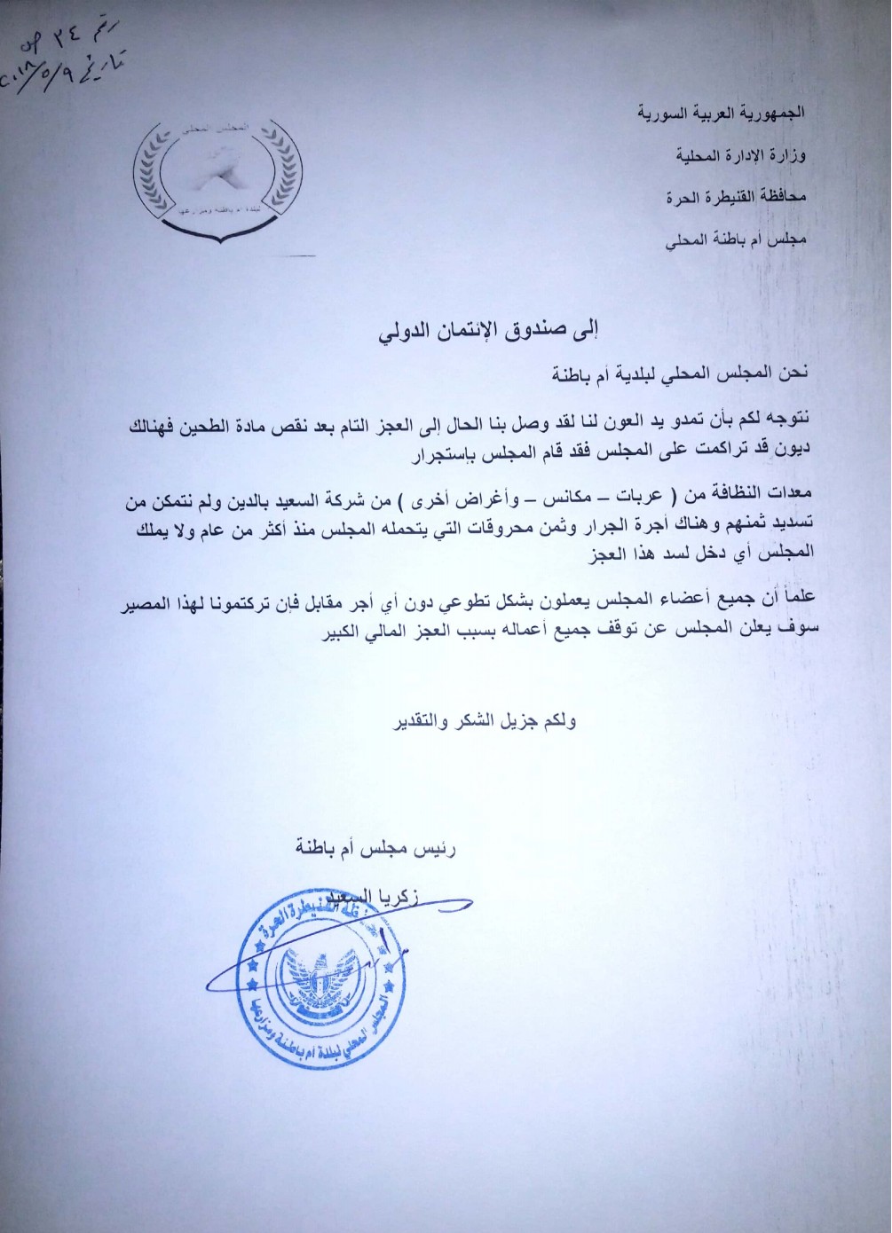 بيان من مجلس بلدية أم باطنة تطالب فيه صندوق الإئتمان الدولي بمد يد العون للمجلس بسبب عجزه المالي