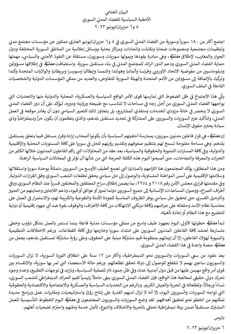 ومن هذا المنطلق، يؤكد المجتمعون هنا التزامهم بالمبادئ التي تجمع الطيف الأوسع من السوريين متمثلةً بوحدة سوريا واستقلالها وسلامتها الإقليمية على أسس المواطنة المتساوية، والوصول إلى حل سياسي يحقق تطلعات الشعب السوري وفق القرارات الدولية, وفي مقدمتها قراري مجلس الأمن رقم ٢١١٨ و ٢٢٥٤، بما يضمن إطلاق سراح المعتقلين والمختفين قسرياً عند النظام السوري وباقي أطراف الصراع، ووصول المساعدات الإنسانية إلى جميع السوريين دونما تمييز أو عوائق أو قيود، ودعم اللاجئين وحمايتهم من التمييز والترحيل القسري حتى تحقيق حل سياسي يوفر الظروف المناسبة للعودة الآمنة والطوعية والكريمة لهم، والاستمرار في العمل على محاسبة نظام الأسد وحلفائه على جرائمهم وكافة مرتكبي الانتهاكات من كافة الأطراف، والوقوف بقوة ضد أي جهود إقليمية أو دولية للتطبيع مع هذا النظام أو إعادة تأهيله.