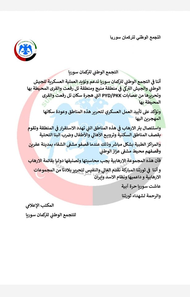 بيان من التجمع الوطني لتركمان سوريا لدعم العملية العسكرية المرتقبة للجيش الوطني والجيش التركي في مناطق تل رفعت ومنبج
