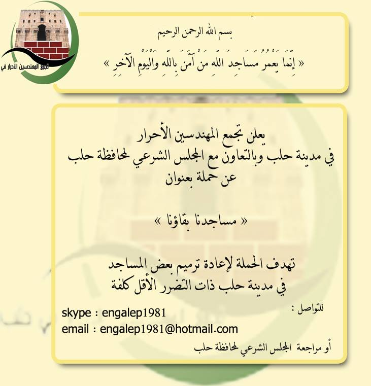 إعلان تجمع المهندسين الأحرار في حلب عن إطلاق حملة لترميم بعض المساجد المتضررة بالقصف في مدينة حلب بالتعاون مع المجلس الشرعي لمدينة حلب