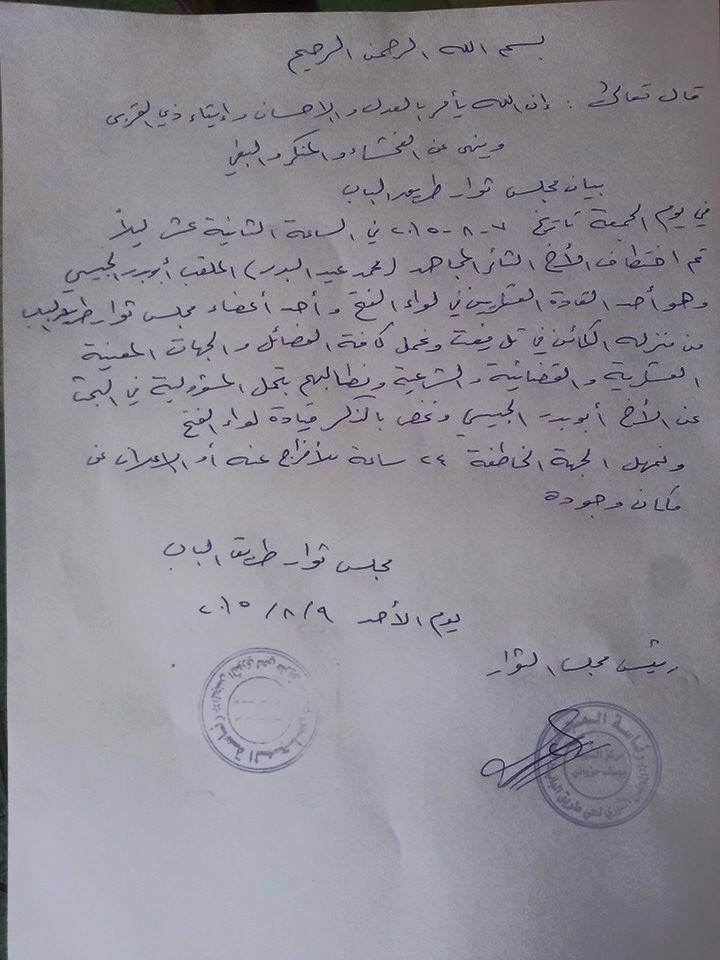 في يوم الجمعة بتاريخ 7/8/2015 في تمام الساعة الثانية عشر ليلآ تم إختطاف الأخ الثائر المجاهد (محمد عيد البدر) الملقب بأبو بدر الجيسي وهو أحد القادة العسكريين في لواء الفتح وأحد أعضاء مجلس ثوار طريق الباب من منزله الكائن في تل رفعت ونحمل كافة الفصائل والجهات المعنية من قضائية وشرعية وعسكرية بتحمل مسؤوليتها في البحث عن الأخ " ابو بدر الجيسي" ونخص بالذكر قيادة لواء الفتح ونمهل الجهة الخاطفة 24 ساعة للإفراج عنه أو الإعلان عن مكان وجوده..