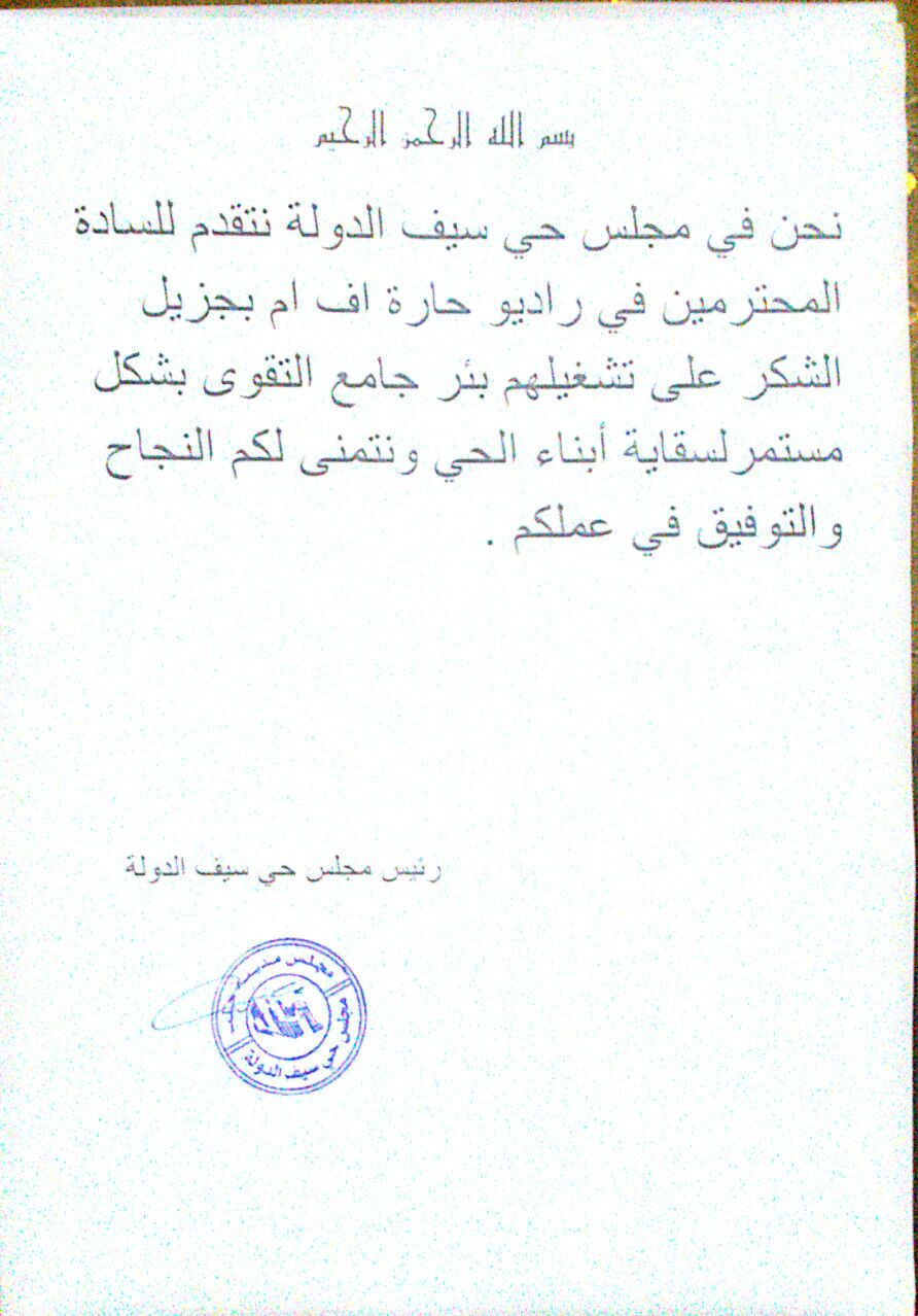 بيان من مجلس حي سيف الدولة يشكر فيه راديو حارة إف إم على تشغيلهم لبئر جامع التقوى لسقاية أبناء الحي